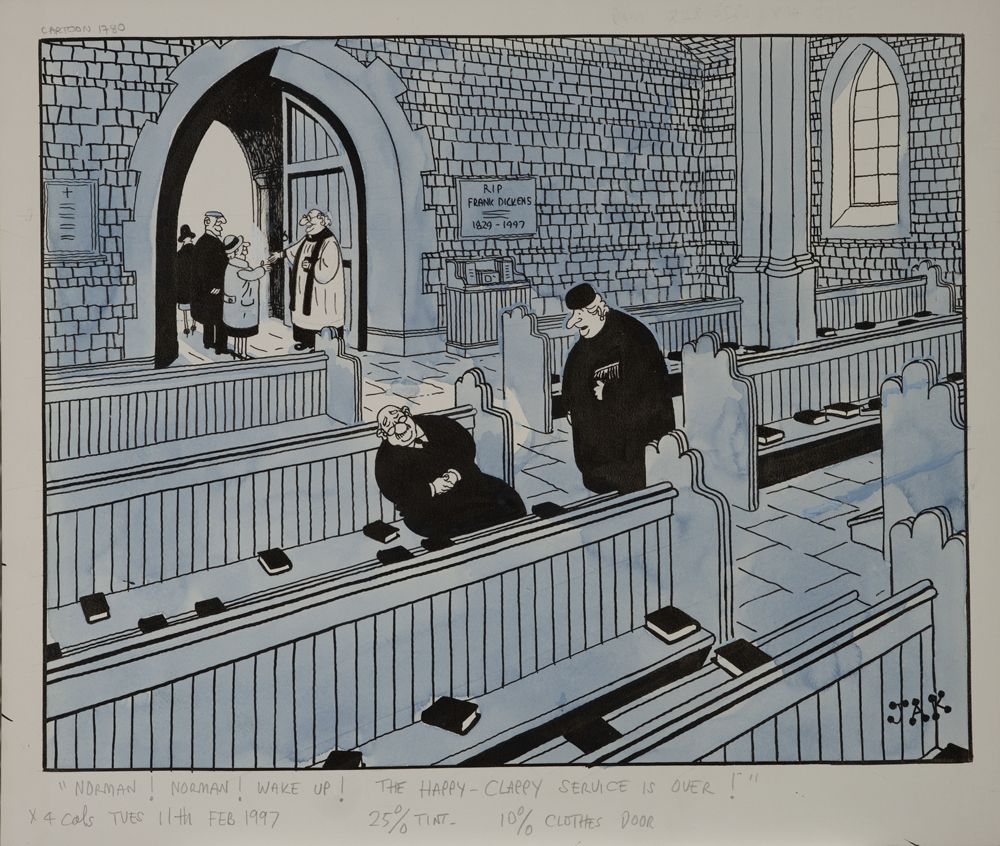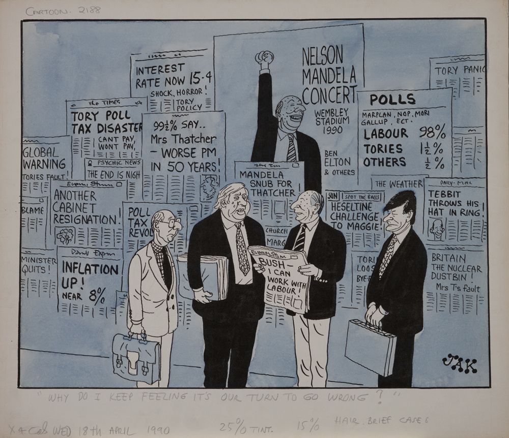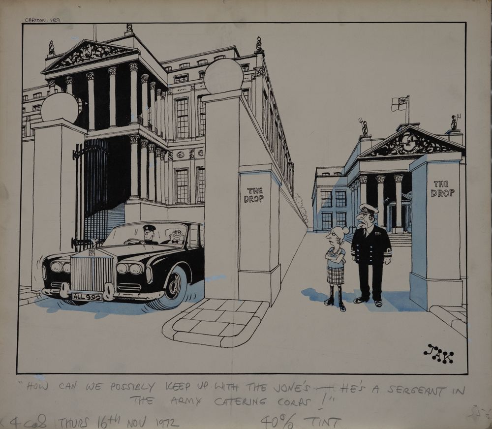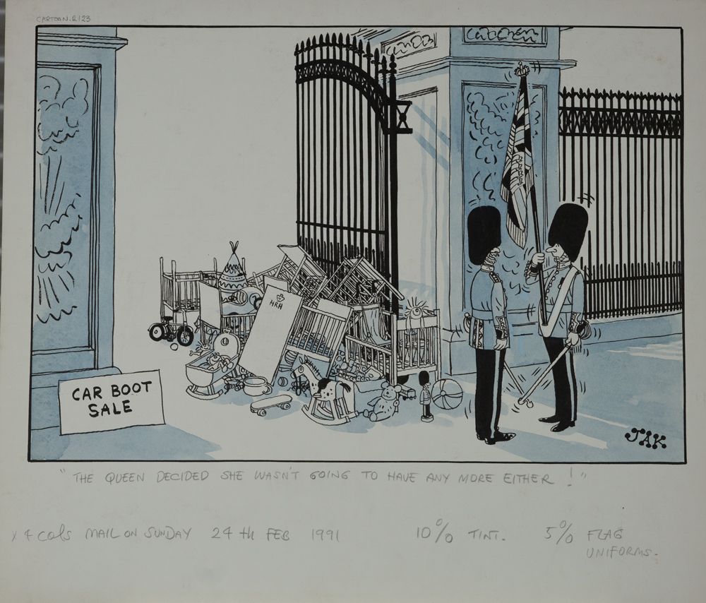 Our original cartoons are priced between £500and £1000 Each piece is meticulously drawn by JAK using a paintbrush and Indian ink on abraded 2mm thick art board. Measuring approximately 24 x 21 inches (60 cm x 54 cm), these artworks capture the essence of JAK's sharp humour and keen observations. Owning an original JAK cartoon means possessing a piece of history that continues to resonate with audiences today.